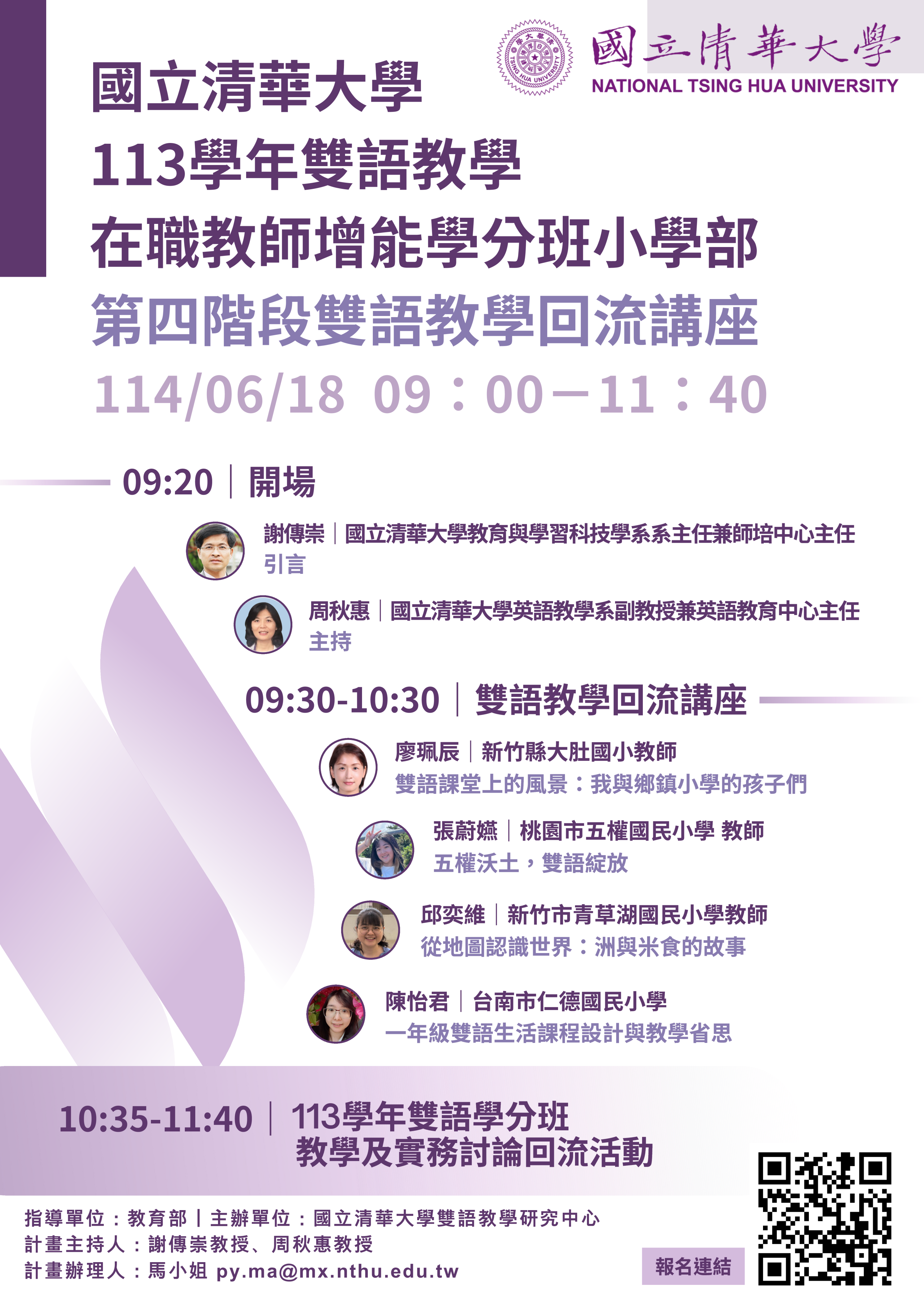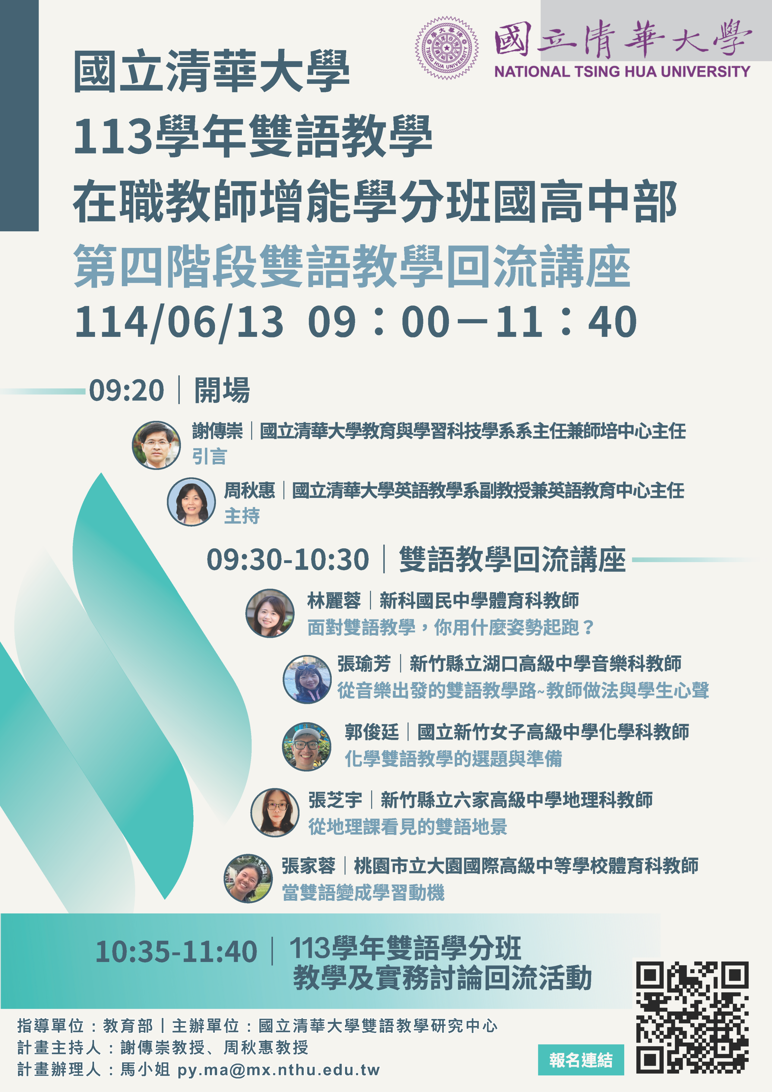 「113學年度中小學雙語教學在職教師增能學分班第四階段回流講座線上辦理」,請惠予公告,邀請所屬教師參加,請查照。 2025-06-09 最新消息 / 校外活動公告 公文 You Might Also Like 檢送國立臺灣師範大學「113學年度國民中小學學習扶助教師增能諮詢 輔導暨多元補強課程模組推動計畫」辦理「國民中學學習 扶助補強暨適性課程模組徵選」簡章1份,敬請協助轉知 所屬教育實習學生、師資生並鼓勵報名參加,請查照 2025-04-28 檢送銘傳大學師資培育中心「無間斷課程設計甄選比賽」 計畫及活動海報,請協助轉知全國之國中在職教師 (含代理教師、實習教師) 或教育相關科系研究生、師資生,請查照。 2022-04-11 檢送本校「112學年度學習扶助教師增能暨補強課程模組研發計畫」辦理「國民中學學習扶助補強暨適性課程模組徵選」簡章1份,敬請協助轉知所屬國民中學學習扶助教 學人員並鼓勵報名參加,請查照。 2023-11-03