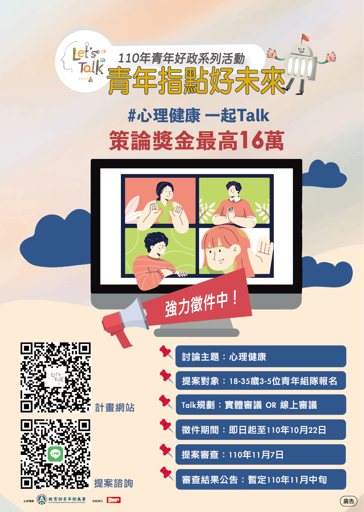【邀請】敬邀參與教育部青年發展署「110年青年好政系列- Let’s Talk」提案 2021-10-01 校外活動公告 為鼓勵青年參與公共事務 賡續辦理 「 Let’s Talk」 計畫 培力青年具備審議知能, 由青年規劃辦理 具備 公共 審議的 Talk 將 對議題的省思轉換為參與政策的動能, 計畫更融入「開放政府」精神 ,讓青年的想法與創意融入政府施政,以利青年在未來公民社會中,扮演更積極的角色。 宣傳海報 提案懶人包 提案簡章 You Might Also Like 檢送國立高雄師範大學綜合活動領域教學研究中心辦理「2025年綜合活動領域優良教案及教材教具徵選活動」,敬請惠允轉知大學師資生、國中小教師、高中教師、國教輔導團輔導員踴躍報名參加,請查照。 2025-04-01 檢送本校教育學系教育專業發展中心辦理「國中學習扶助補強課程模組實戰分享研習」簡章1份,敬請協助轉知所屬國民中學學習扶助教學人員(專任教師、代理代課教師、教育實習學生、師資生)並鼓勵報名參加,請查照。 2025-07-08 本部委請國立屏東大學辦理「第十二屆師資培育國際學術研討會」已開放報名,請鼓勵所屬人員踴躍報名參與,詳如說明,請查照。 2024-08-07