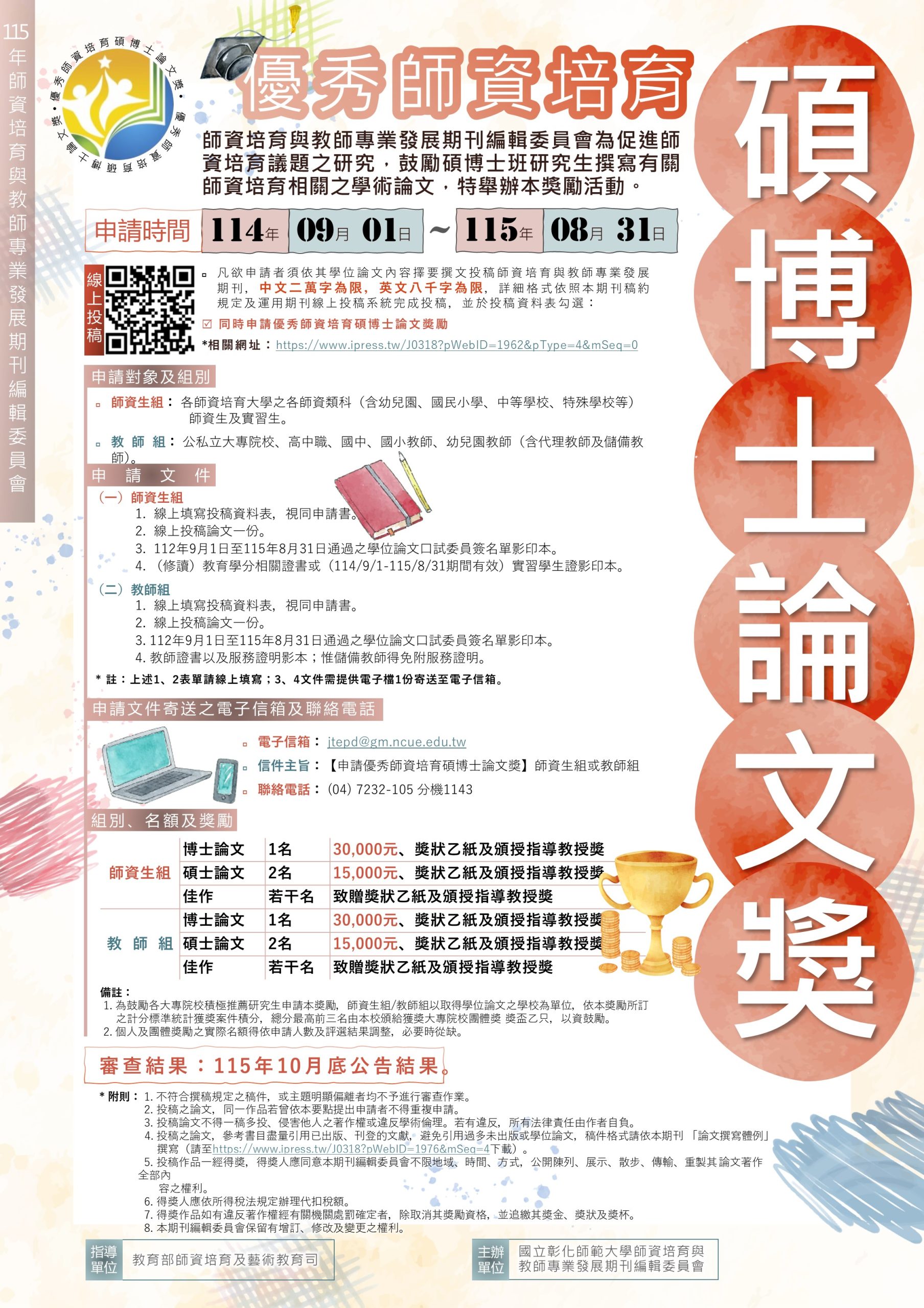函轉國立彰化師範大學《師資培育與教師專業發展期刊》 編輯委員會辦理「優秀師資培育碩博士論文獎」,請鼓勵符合資格之教師及師資生踴躍申請,詳如說明,請查照。 2025-09-10 最新消息 / 校外活動公告 來文一 來文二 You Might Also Like 師培中心114-2預開課程表(11/12版) 2025-12-01 樂學網科技股份有限公司檢送本公司教師甄試免費講座資訊一份 2022-05-11 檢送探究與實作課程北區推動中心辦理「科學量測數據擷取」教師工作坊,敬請惠予轉知師資培育生,請查照。 2025-11-20