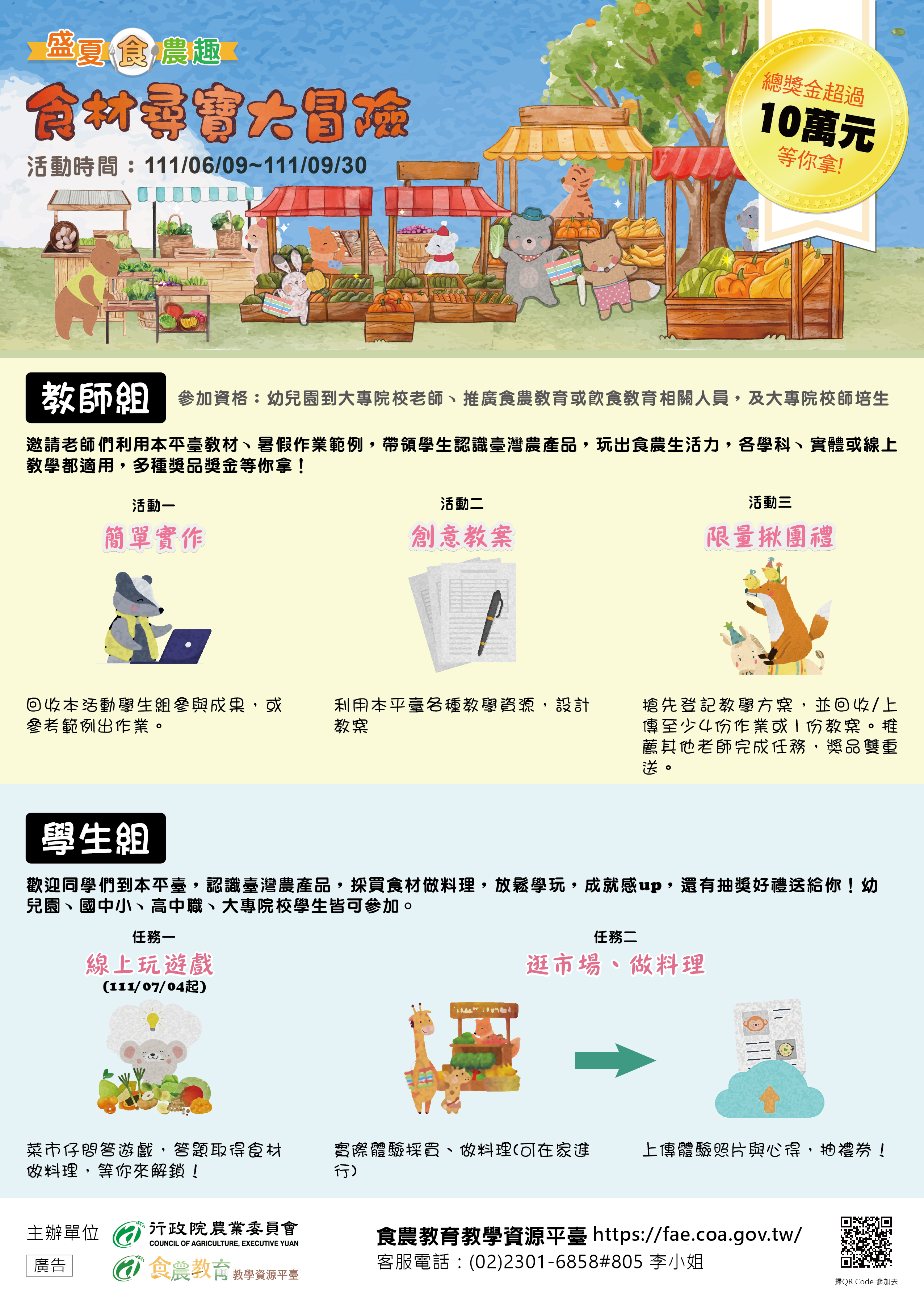 函轉行政院農業委員會111年6月9日至9月30日於食農教育 教學資源平臺辦理「盛夏食農趣:食材尋寶大冒險」活動 ,總獎金超過10萬元,請協助宣導並鼓勵師資生參加,請查照。