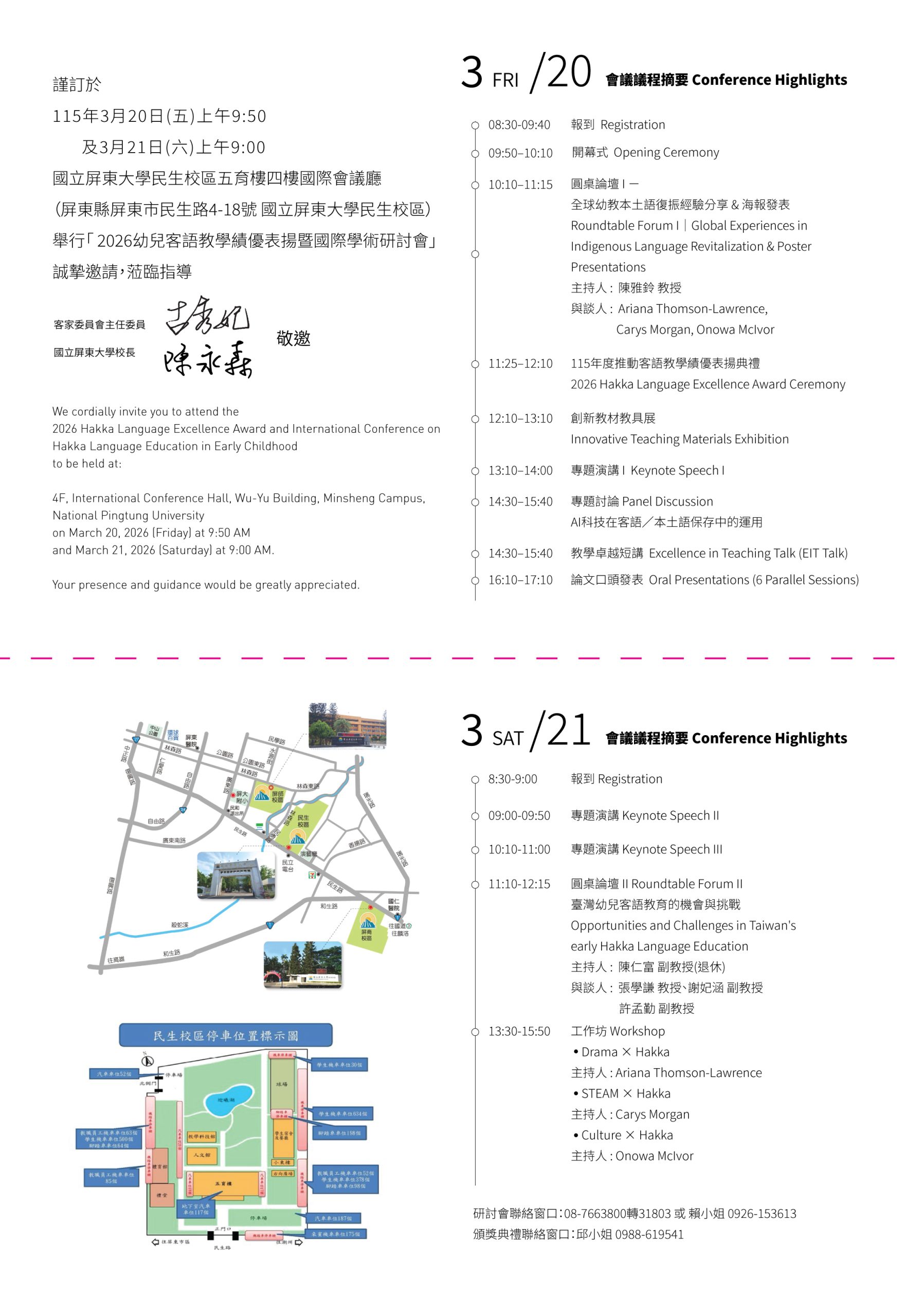 國立屏東大學幼兒教育學系辦理「2026幼兒客語教學績優表揚暨國 際學術研討會-全球視角的幼兒客語教育跨文化學習與語言傳承」,請惠予公告,並鼓勵所屬師生踴躍報名參加, 請查照。 2026-03-13 最新消息 / 校外活動公告 來文 You Might Also Like 有關教育部國民及學前教育署委託國立臺灣師範大學心理與教育測驗研究發展中心(以下稱心測中心)辦理113年「素養導向課室評量資源建置暨推廣計畫」之國中素養導向課室評量系列專題講座,敦請各大專院校轉知所屬師資培育學院、師資培育中心、教育系所之師資培育生活動及報名資訊,請查照。 2024-10-25 國立臺灣大學師資培育中心辦理114年教育理論與實務對話「多元社會下教師的多維與難為」研討會,敬請協助轉知貴屬中等學校教師、實習生、師培生踴躍參加,請查照。 2025-11-03 113學年度「師資培育助學金」錄取名單 2024-09-03