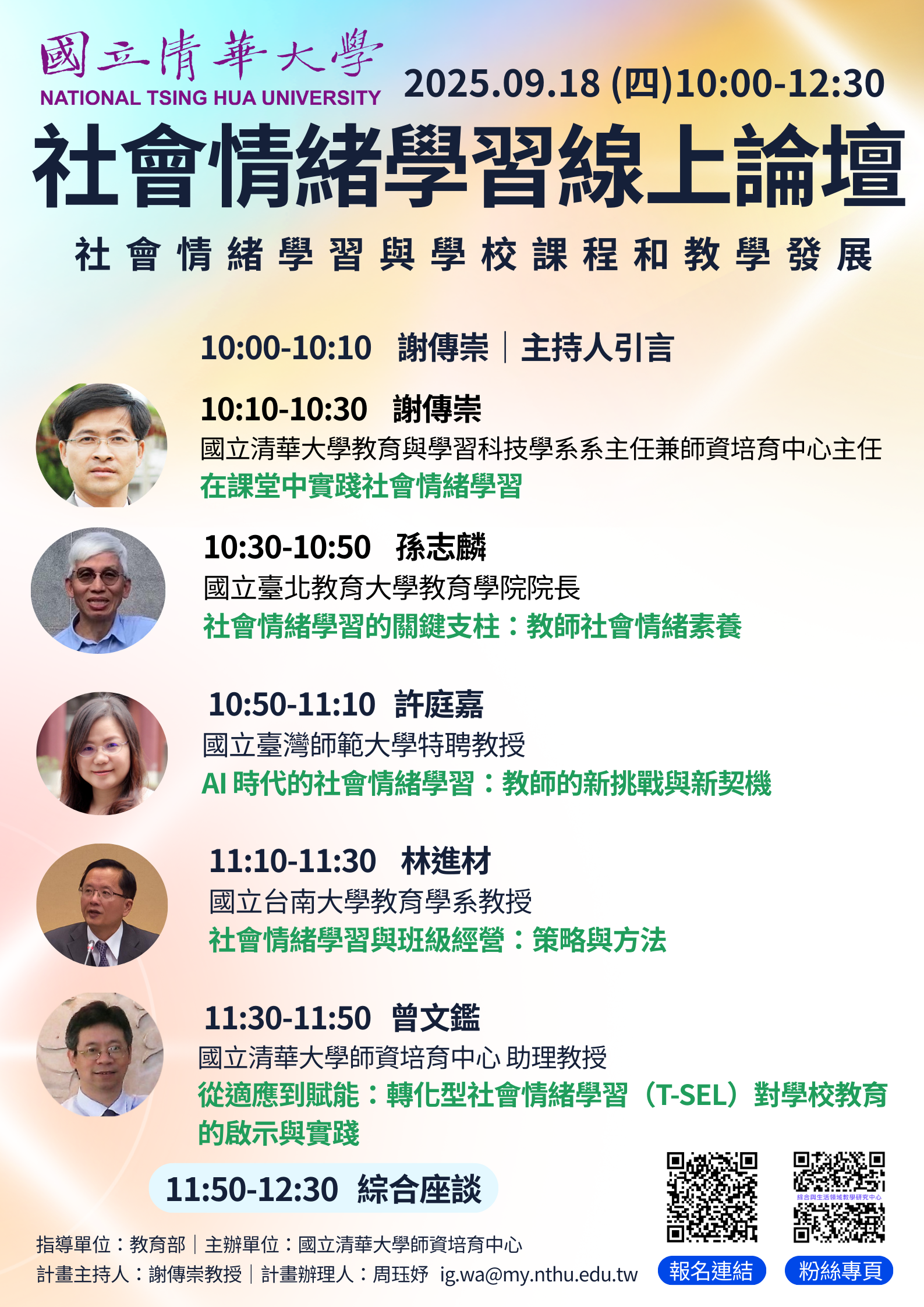 國立清華大學訂於114年9月18日(星期四)上午10時至12時30分, 辦理「社會情緒學習-社會情緒學習與學校課程和教學發 展」線上論壇,請惠予公告,請查照。 2025-09-10 最新消息 / 校外活動公告 來文 You Might Also Like 檢送本校數學學習領域教學中心與台灣數學教育學會共同辦理「112學年度小學、中學數學教學演示競賽」活動簡章乙式,敬請貴校協助公告所屬小學、中等教育學程學生週知,請查照。 2023-08-29 檢送探究與實作課程北區推動中心辦理「113-2自然科學探究與實作命題及教材教法系列工作坊」實施計畫,敬請惠予轉知師資培育生,請查照。 2025-02-24 有關《教育傳播與科技研究》第 136 期徵稿啟事(附件),請轉知所屬師生並踴躍投稿,請查照。 2024-01-23