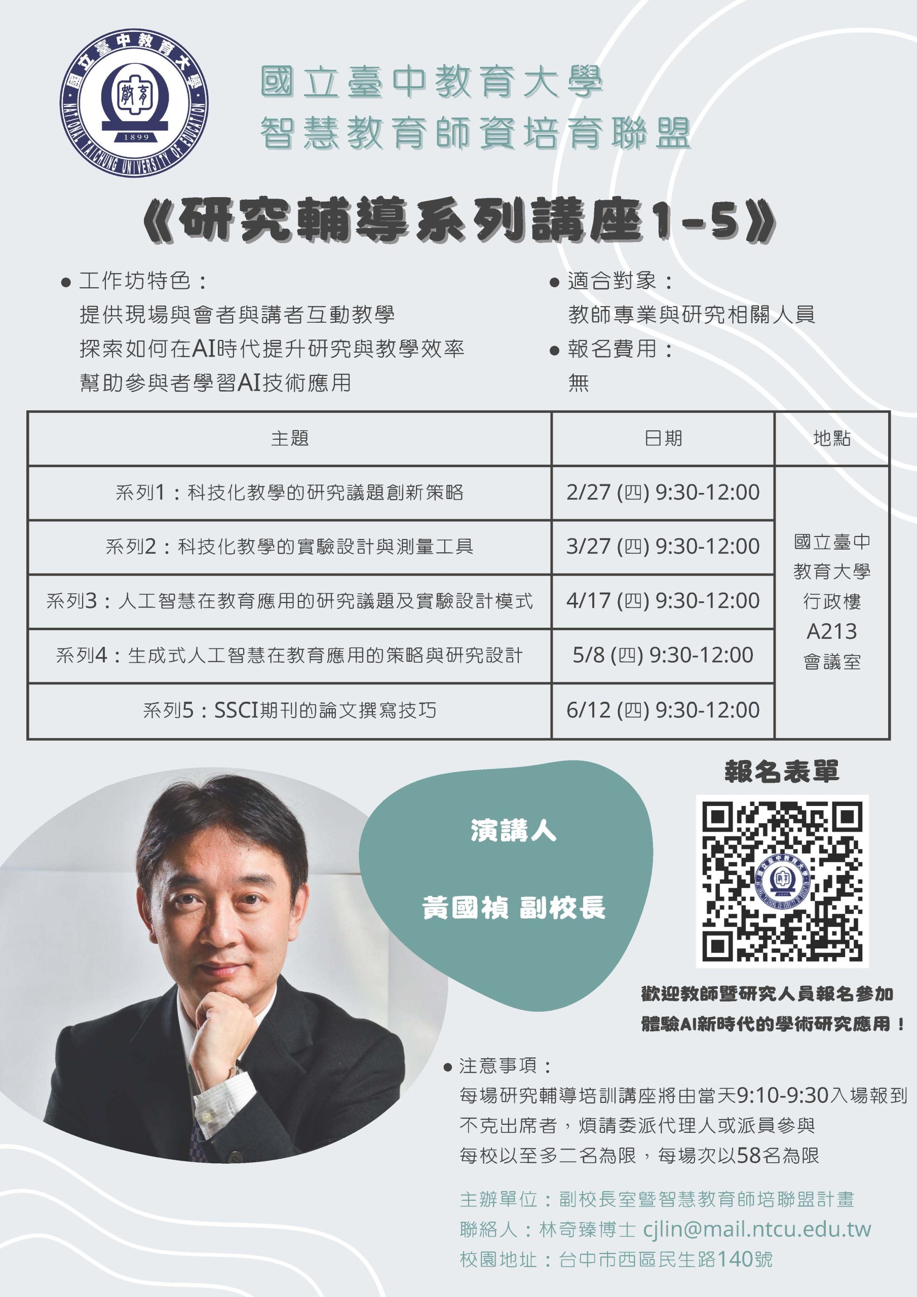 國立臺中教育大學智慧教育師資培育聯盟辦理「研究輔導系列講座」, 歡迎貴校有興趣師生踴躍報名,請查照。 2025-02-18 最新消息 / 校外活動公告 來文 You Might Also Like 檢送本校辦理「師資生潛能測驗系統」之學生測驗報表導讀說明活動,敬請協助轉知學生及宣傳,請查照。 2023-05-23 【中原大學師資培育中心111學年度中等教育學程第28屆榜單】 2022-06-16 有關「教育部補助師資培育大學辦理國外教育見習教育實習及國際史懷哲計畫」,開放跨校補助各師資培育大學符合資格之中等學校師資類科師資生5名,請惠予協助公告周知,請查照。 2025-05-13