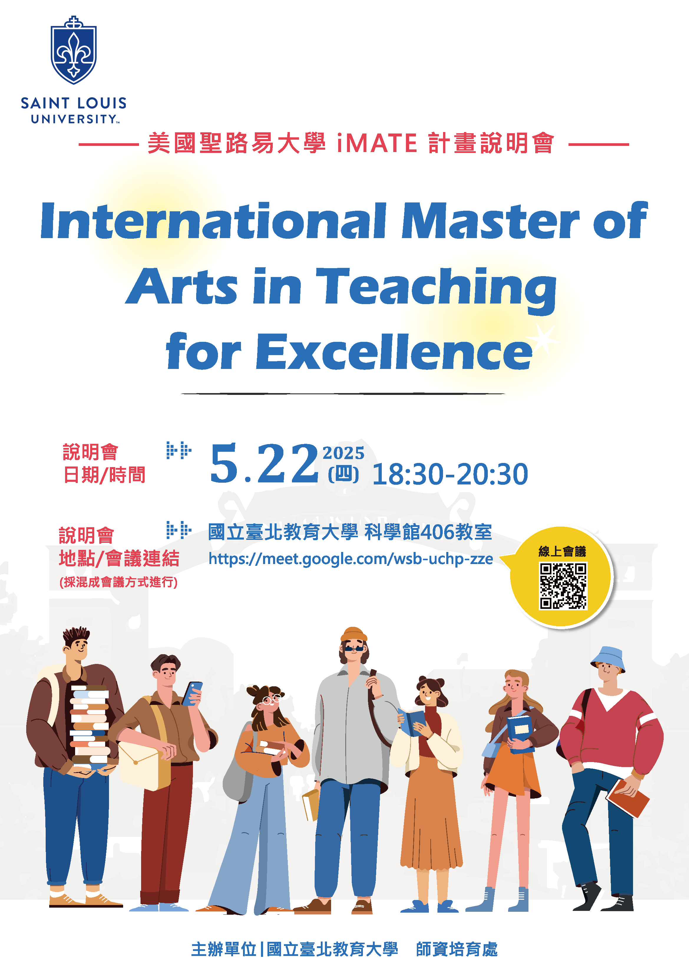 國立臺北教育大學辦理「美國聖路易大學iMAT計畫說明會」,敬請貴校廣為周知,並鼓勵學生踴躍參加,詳如說明,請查照。 2025-05-20 最新消息 / 校外活動公告 來文 iMATE簡介 You Might Also Like 本校師資培育中心辦理「2021自主學習的探究、實踐與反思學術研討會」資訊 2021-03-11 本署委請國立東華大學辦理「十二年課綱原住民族教育議題推廣計畫」相關活動,敬請轉知所屬踴躍參與,請查照 2024-03-25 112學年度「師資培育助學金」申請公告 2023-08-07