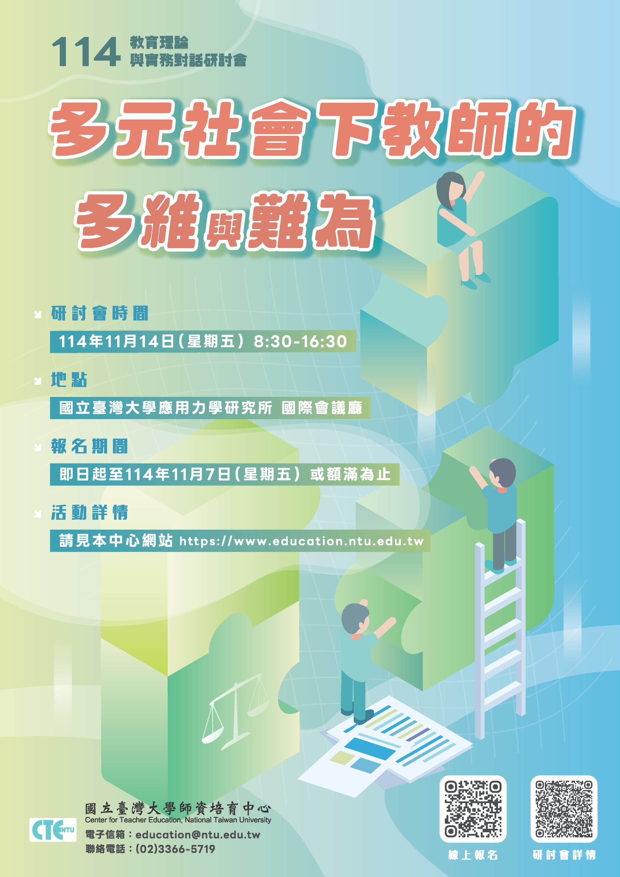 國立臺灣大學師資培育中心辦理114年教育理論與實務對話「多元社會下教師的多維與難為」研討會,敬請協助轉知貴屬中等學校教師、實習生、師培生踴躍參加,請查照。 2025-11-03 最新消息 / 校外活動公告 來文 You Might Also Like 114學年度「師資培育獎學金甄選」申請公告 2025-08-07 檢送國立高雄師範大學辦理師資培育之大學「114年人權教育(含轉型正義)教案徵件競賽」徵選辦法公告1份,請公告周知並鼓勵師資生、實習學生參與投件,請查照。 2025-02-27 檢送本校「112學年度學習扶助教師增能暨補強課程模組研發計畫」辦理「國民中學學習扶助補強暨適性課程模組徵選」簡章1份,敬請協助轉知所屬國民中學學習扶助教 學人員並鼓勵報名參加,請查照。 2023-11-03