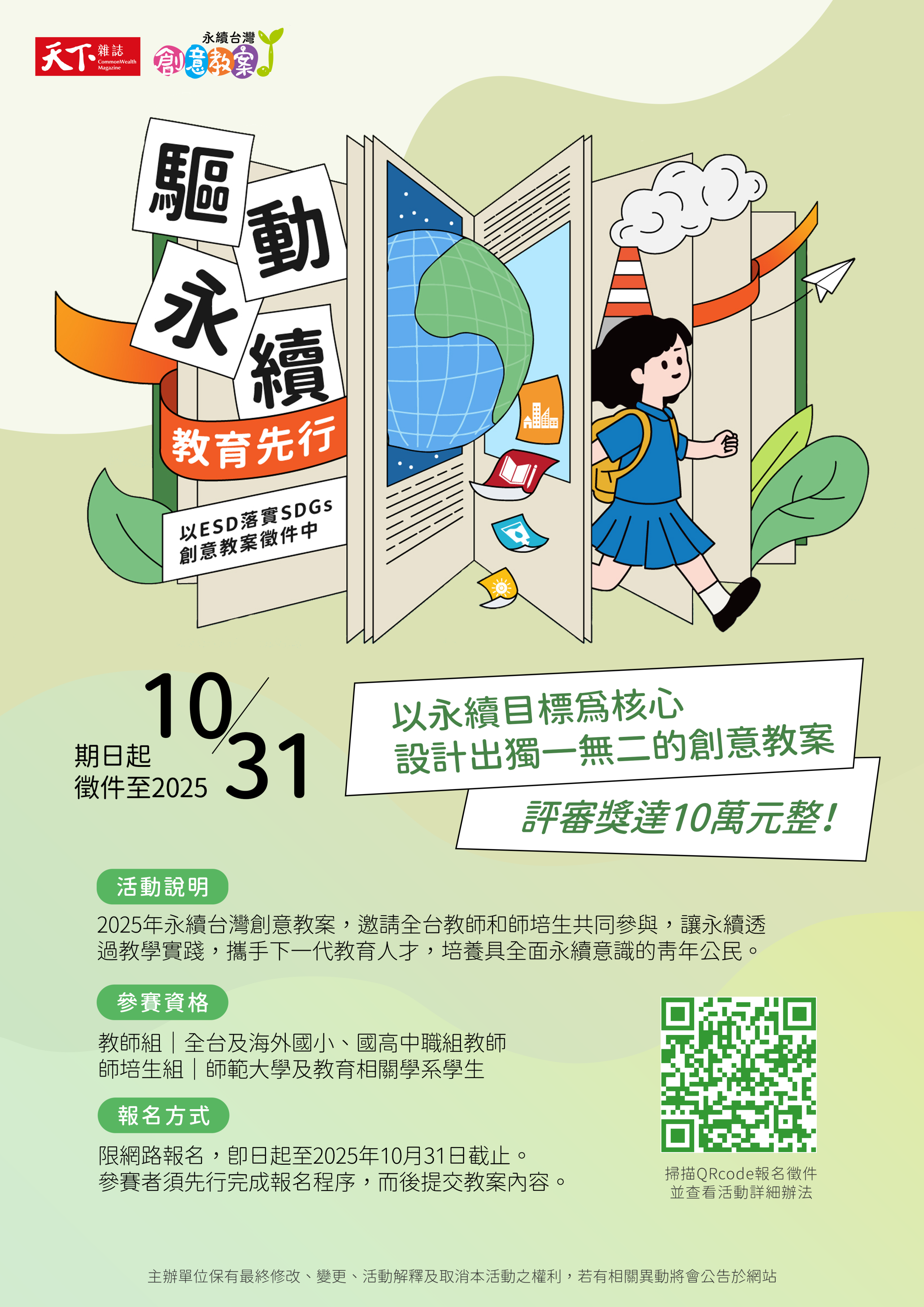 敬邀貴校師資培育中心及相關學程惠予鼓勵學生踴躍參與2025「永續台灣創意教案」徵選活動,共育未來永續教育人才。 2025-05-13 最新消息 / 校外活動公告 來文 教案徵選活動辦法 You Might Also Like 113學年度「師資培育獎學金」錄取名單 2024-09-03 中原大學113學年度中等教育學程甄試-申請說明會影音檔及簡報檔 2024-04-12 臺北市立百齡高級中學112學年度代理、兼任與代課教師甄選資訊 2023-08-17