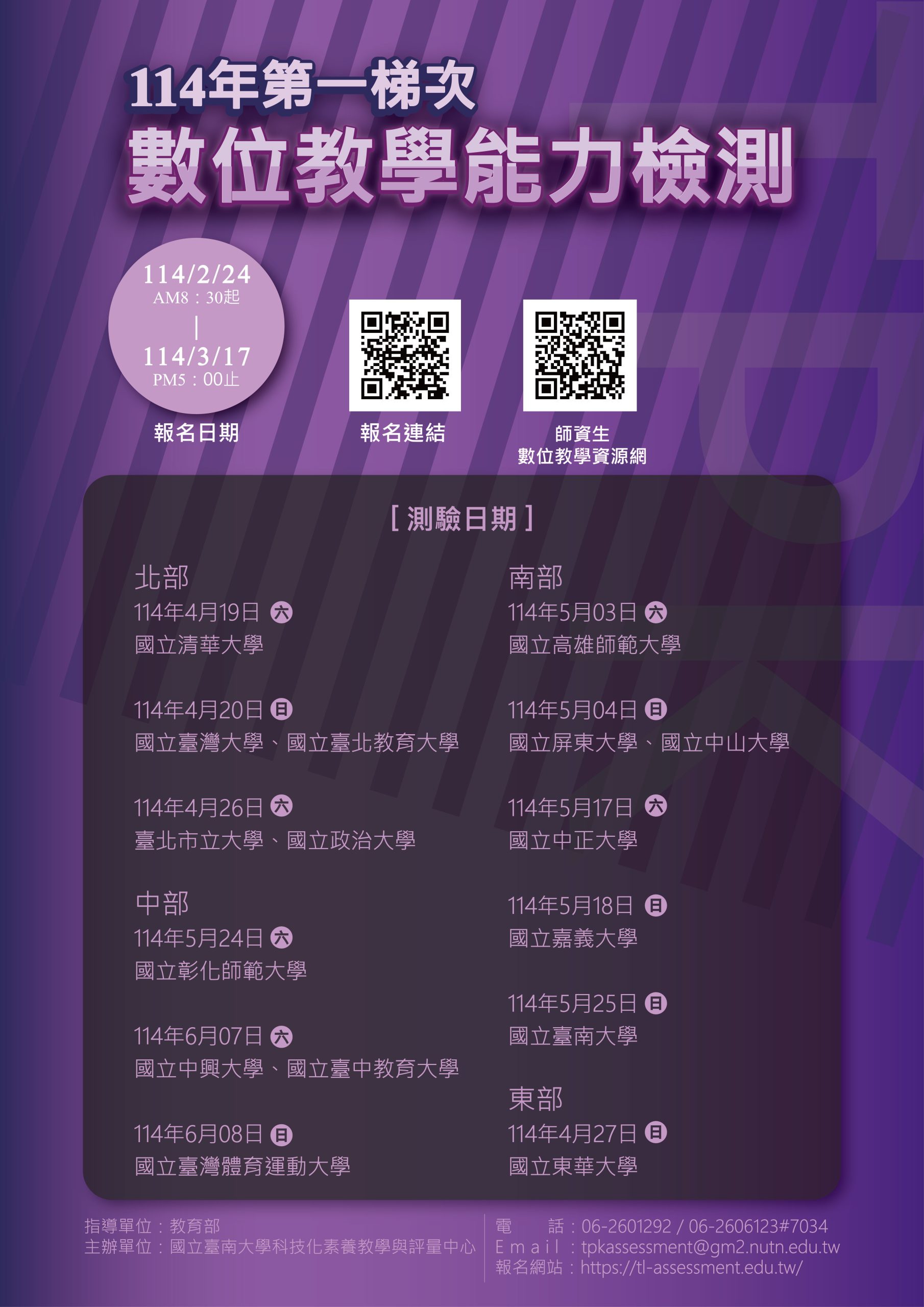 有關本部委託國立臺南大學辦理114年第一梯次數位教學能力檢測相關事宜一案,請鼓勵師資生踴躍參加,詳如說明,請查照。 2025-02-27 最新消息 / 校外活動公告 來文 114數位教學能力檢測簡章 You Might Also Like 檢送臺北市立大學辦理「教育部114年新世代校長創新領導學術研 討會」實施計畫、報名海報,敬請貴校函轉師資培育相關學系師生報名參加,請查照。 2025-09-12 有關法務部編印之「不可不知的人權兩公約測驗題庫」(修訂2版)一案,請於師資培育人權教育議題等相關課程參考運用,請查照。 2023-12-06 函轉「112年下半年僑(華)校教師徵才訊息」彙整表1份(如附件),請協助公告周知,請查照。 2023-08-03
