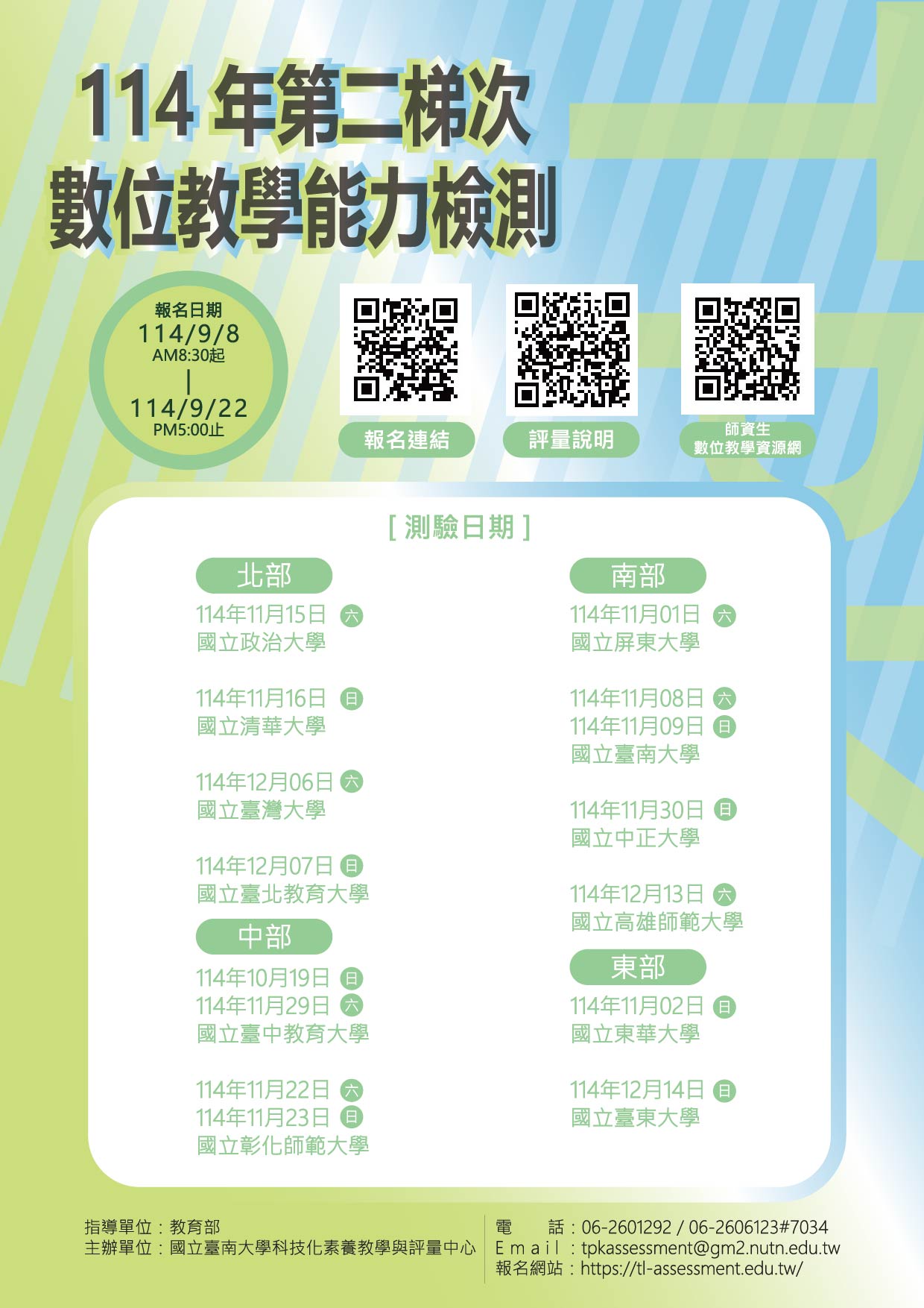 有關本部委託國立臺南大學辦理114年第二梯次數位教學能力檢測相關事宜一案,請鼓勵師資生踴躍參加,詳如說明,請查照。 2025-09-08 最新消息 / 校外活動公告 來文 報名簡章 You Might Also Like 國立清華大學師資培育中心訂於113年10月7日下午1時至3時30分, 辦理「人權教育 VS.學校課程」線上論壇,請惠予公告, 請查照。 2024-10-01 國立東華大學外語領域教學研究中心辦理111年度職前教師中等學校或小中銜接「議題或聯合國永續發展目標之UbD教學任務雙語/英語簡報設計」甄選案,請轉知並鼓勵所屬教師踴躍參加,請查照。 2022-07-27 國立臺灣大學師資培育中心辦理「高等教育國際論壇暨成果展師資培育中心系所演講」,敬請協助轉知貴屬教師、實習老師、師培生、學生踴躍參加,請查照。 2025-11-04