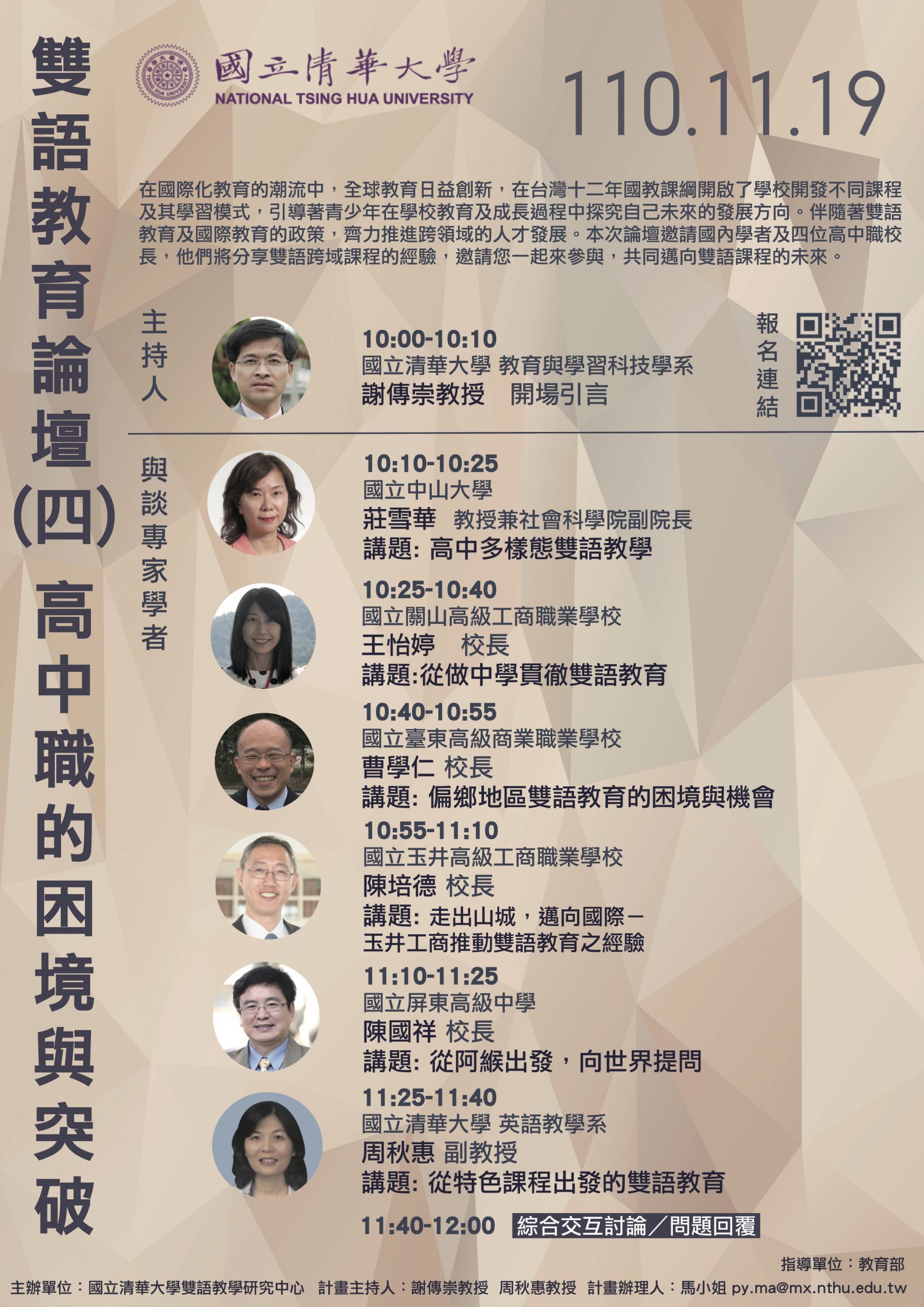 本校訂於110年11月19日上午10點至12點,辦理「雙語教育論壇(四):高中職的困境與突破」線上論壇,請惠予公告,並邀請所屬教師參加,請查照。 2021-11-12 校外活動公告 來文 附件 You Might Also Like 懇請貴局處及各校協助轉發「2025-26年全國公民行動方 案種子教師工作坊」活動訊息至轄下各級學校、師培中 心,請查照。 2025-08-06 有關本校雙語教學研究中心辦理「113學年度國小雙語教案設計競賽線上表揚暨獲獎作品發表會」相關活動資訊, 請協助轉知並鼓勵所屬人員踴躍報名,請查照。 2025-02-12 檢送本校辦理「師資生潛能測驗系統」之學生測驗報表導讀說明活動,敬請協助轉知學生及宣傳,請查照。 2023-05-23