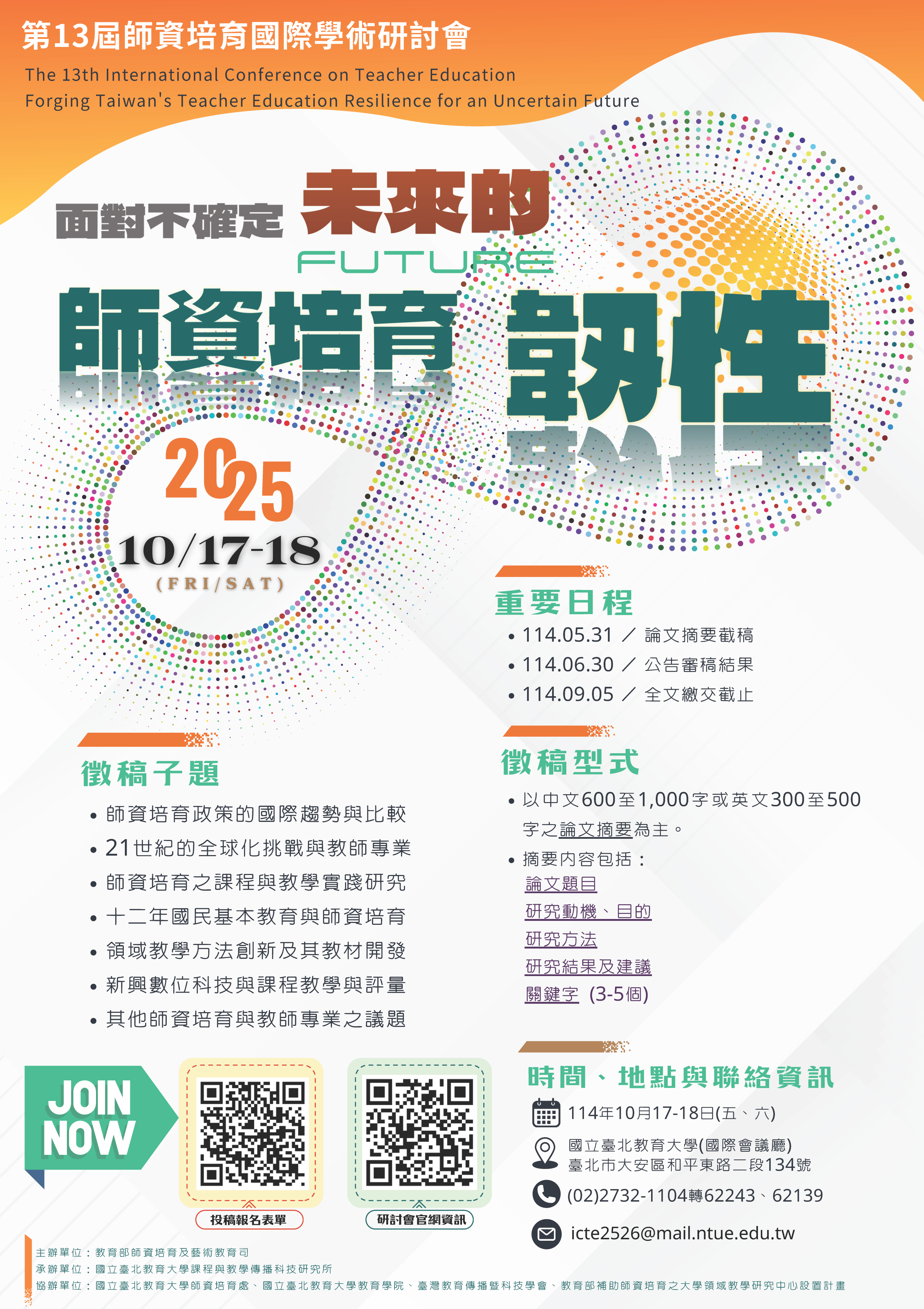 本部委請國立臺北教育大學辦理「第十三屆師資培育國際學術研討會」徵稿活動,請各師資培育之大學鼓勵所屬教師及博碩士生踴躍報名投稿,詳如說明,請查照。 2025-03-07 最新消息 / 校外活動公告 各位師培先進們好:一、教育部委請國立臺北教育大學辦理 「第13屆師資培育國際學術研討會—面對不確定未來的師資培育韌性」,將於114年10月17日至18日(週五至週六)假國立臺北教育大學至善樓國際會議廳舉行。檢附本研討會海報電子檔供參。二、有關本研討會論文徵稿資訊,教育部已於114年2月25日函文(臺教師(四)字第1142600492號)通知各師資培育大學,並由本校同步寄出紙本海報 。因紙本海報上未標註相關說明,特來信補充,敬請貴單位惠予協助張貼海報,並轉知所屬教師及博碩士生踴躍報名投稿,以利宣傳推廣。三、有關本研討會相關資訊如下,敬請參考: 研討會官網:https://icte2025.ntue.edu.tw 論文摘要投稿表單:https://forms.gle/9aUv6a5ZPTabkDMaA若有任何問題,歡迎隨時來信或來電聯繫,感謝您的協助與支持! 來文 論文摘要格式及徵稿啟事 You Might Also Like 財團法人人本教育文教基金會預計舉辦「人本教育學程」免費進修課程,其中包含 【教學的哲學與實務】及【森林小學教育實習】,惠請學校公告訊息於網站,或將此活動訊息email給貴系所學生。 2025-09-04 國立屏東大學預計舉辦「110-111年度國外教育見習教育實習及國際史懷哲計畫之成果海報展(臺北場)」,敬邀貴校師生同仁參加,請查照。 2025-02-27 賀!! 本校師資培育中心113年度教師資格檢定考試通過名單 2024-07-29