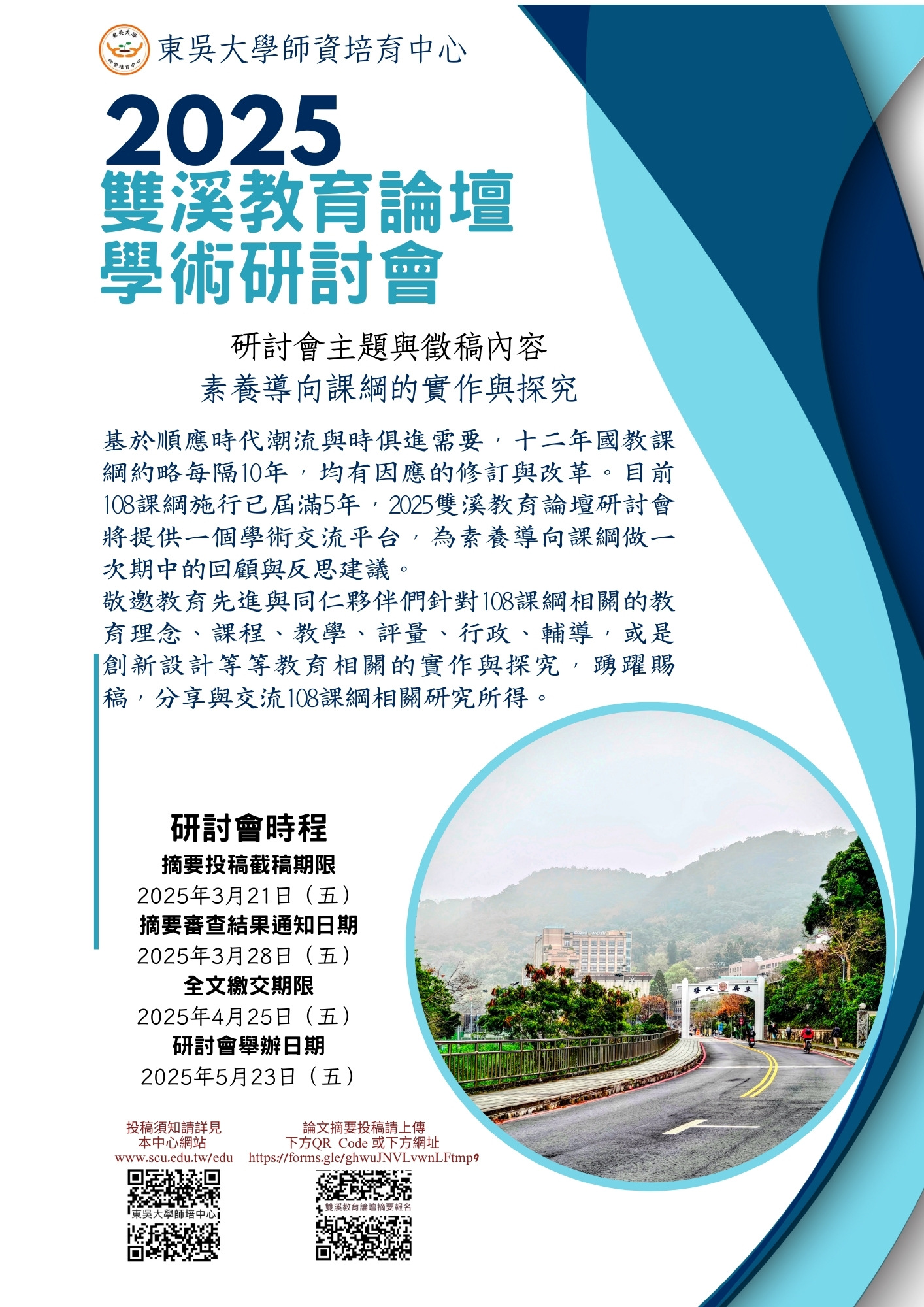 東吳大學師資培育中心辦理「2025雙溪教育論壇學術研討會」,敬邀貴校教育相關學系或師資培育中心師生踴躍投 稿,敬請惠予公告周知,請查照。 2025-03-07 最新消息 / 校外活動公告 來文 研討會論文摘要表格 論文全文格式說明 You Might Also Like 因應雙語國家政策,未來的教育政策將會走向雙語教學並將有大量雙語教師的需求產生 2021-01-18 【中原大學師資培育中心112學年度中等教育學程第29屆榜單】 2023-06-09 中原大學113學年度中等教育學程甄試 報名開跑囉!! 2024-04-22