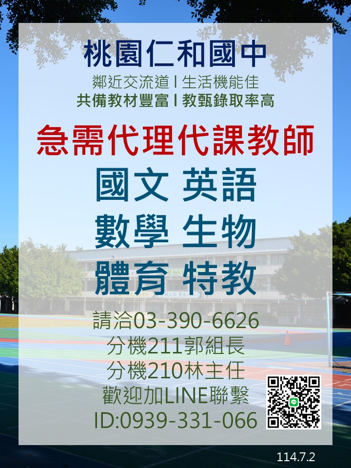 桃園市立仁和國民中學114學年度代理代課教師甄選資訊 2025-07-10 教師甄選公告 / 最新消息 You Might Also Like 中原大學師資培育中心「2021雙語與AI數位教學學術研討會」論文摘要初審結果公告 2021-12-09 新北市樹林區柑園國民小學114學年度代理教師甄選簡章 2025-07-10 2021自主學習的探究、實踐與反思學術研討會徵稿資訊 2021-02-18