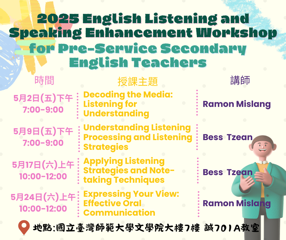 檢送國立臺灣師範大學英語學系辦理「中等學校英語文師資生英語聽說增能系列工作坊」活動海報1份,敬請協助公告宣傳並惠 予出席人員公(差)假,請查照。 2025-05-06 最新消息 / 校外活動公告 來文 You Might Also Like 函轉東莞台商子弟學校112學年度第2學期教師甄選簡章(如附件),請協助公告周知,請查照。 2023-12-21 關於112學年度第一學期諾瓦中小學暨幼兒園教師甄試相關訊息,敬請貴單位協助公告於教師甄試相關公布欄或網頁平台。 2023-06-02 有關國立臺北教育大學辦理「第13屆師資培育國際學術研討會」論文摘要徵件期限延長至114年6月30日(星期一),敬請協助公告並轉知所屬教師及碩博士生踴躍投稿報名參與,詳如說明,請查照。 2025-06-09