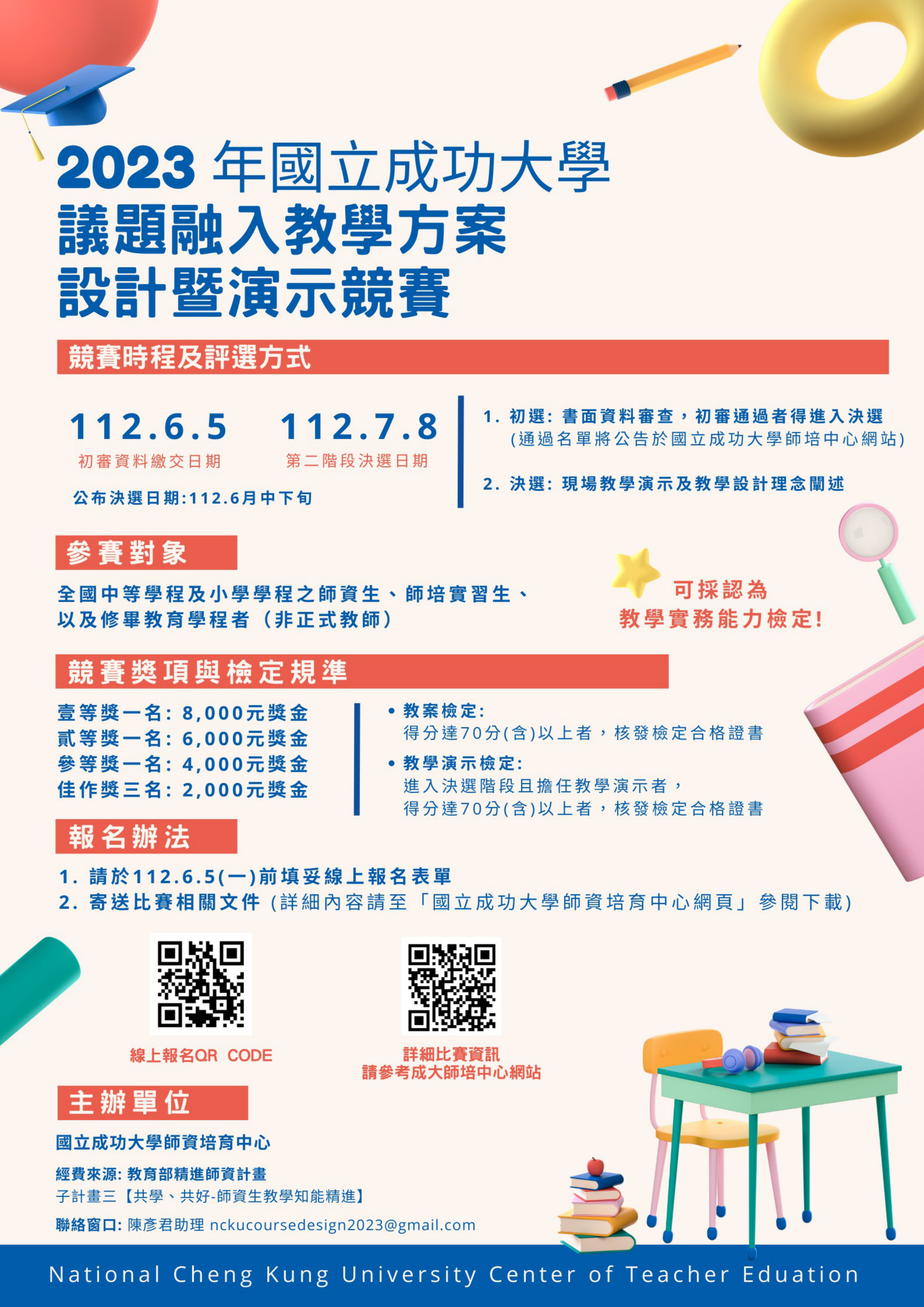 檢送成功大學校師資培育中心辦理「2023年議題融入教學方案設 計暨演示競賽」,敬請惠予協助公告並鼓勵所屬師資生、 實習生、修畢教育學程者踴躍報名參加,請查照。 2023-03-13 最新消息 / 校外活動公告 來文 競賽簡章 You Might Also Like 本校訂於114年10月23日(星期四)上午10時至12時30分,辦理「社會情緒學習線上論壇-社會情緒學習與親師合作」線上論壇,請惠予公告,請查照。 2025-10-14 中原大學113學年度中等教育學程甄試 報名開跑囉!! 2024-04-22 112學年度教育實習行前說明會公告 2023-05-29