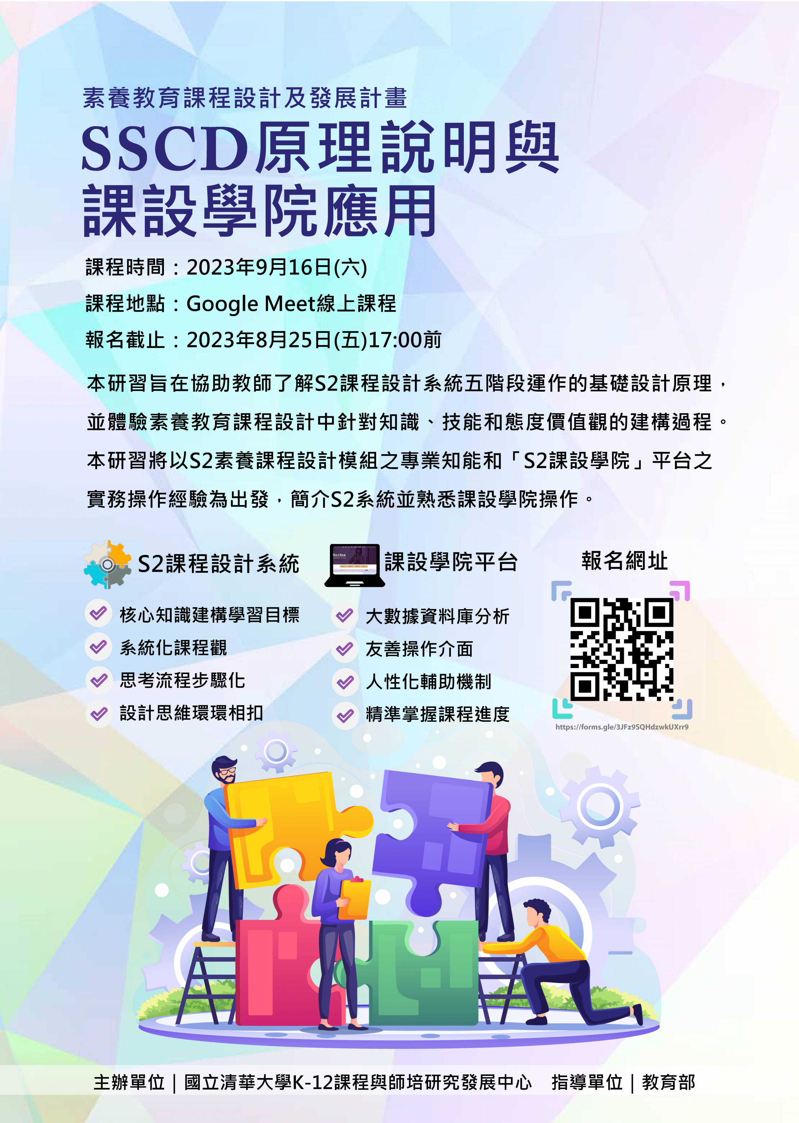 檢送本部委請國立清華大學辦理「素養教育課程設計及發展計畫:SSCD原理說明與課設學院應用課程」實施計畫及海報各1份,請鼓勵所屬人員踴躍報名參與,請查照。 2023-08-03 最新消息 / 校外活動公告 來文 素養教育課程設計及發展計畫 You Might Also Like 有關國立臺北教育大學辦理「第13屆師資培育國際學術研討會」論文摘要徵件期限延長至114年6月30日(星期一),敬請協助公告並轉知所屬教師及碩博士生踴躍投稿報名參與,詳如說明,請查照。 2025-06-09 本部委託國立清華大學執行「素養教育課程設計及發展計畫」,訂於111年1月24日至28日舉辦「2022寒假課程設計技術研習營」,請鼓勵貴屬教師踴躍參加並惠允公假,請查照。 2021-11-15 「BULATS劍橋博思國際職場英語檢測」於民國108年12月正式更名並升級為「Linguaskill」 2021-01-18