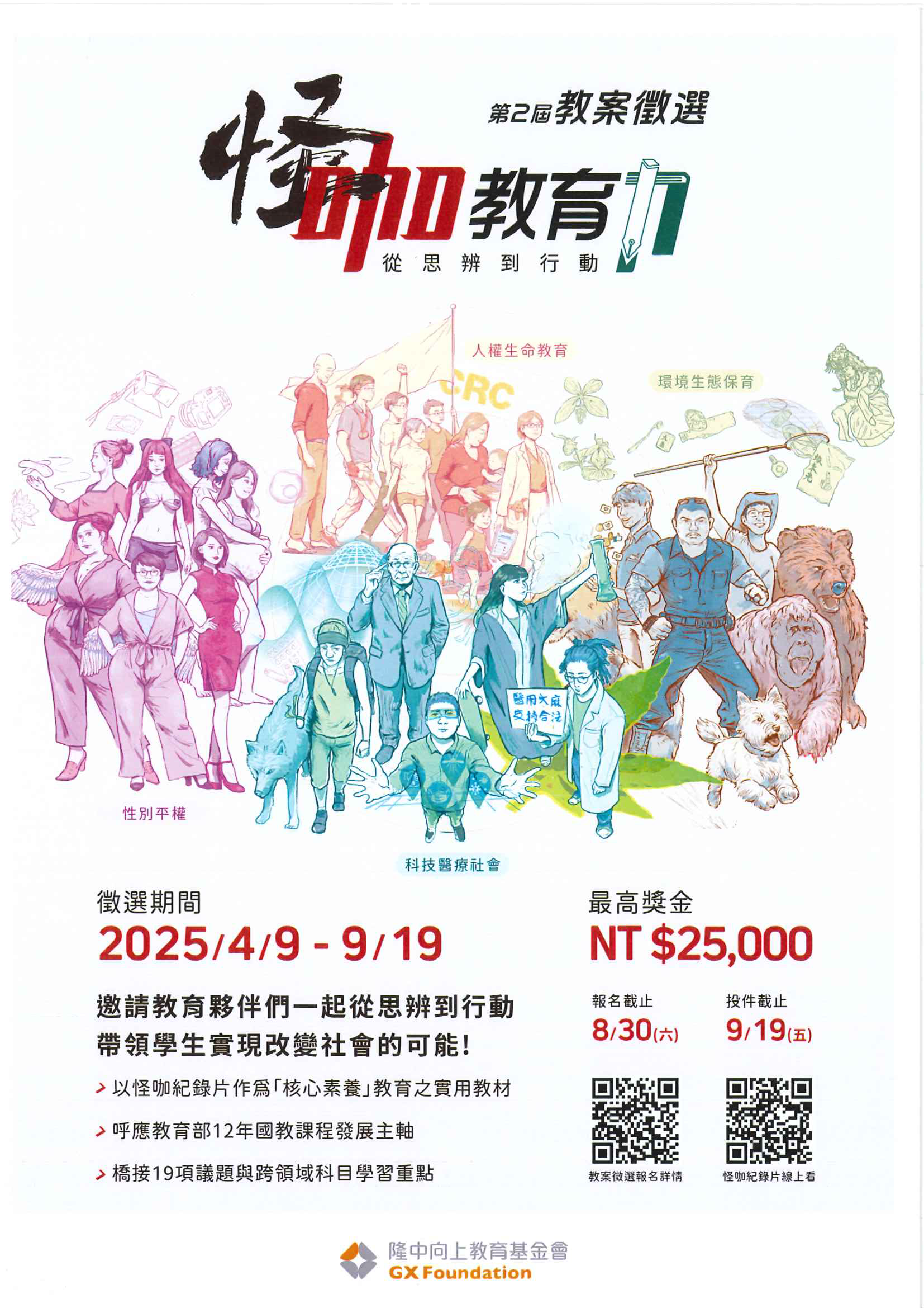轉知財團法人隆中向上教育基金會辦理「2025從思辨至行動:第二屆怪咖教案徵選」活動,請鼓勵師資生、實習學生參與,詳如說明,請查照。 2025-05-06 最新消息 / 校外活動公告 來文 活動簡章 You Might Also Like 檢送112學年度桃園市振聲高級中等學校教師甄選公告 2023-05-01 函轉行政院農業委員會111年6月9日至9月30日於食農教育 教學資源平臺辦理「盛夏食農趣:食材尋寶大冒險」活動 ,總獎金超過10萬元,請協助宣導並鼓勵師資生參加,請查照。 2022-06-10 中原大學112學年度中等教育學程甄試-申請切結書 2023-03-20
