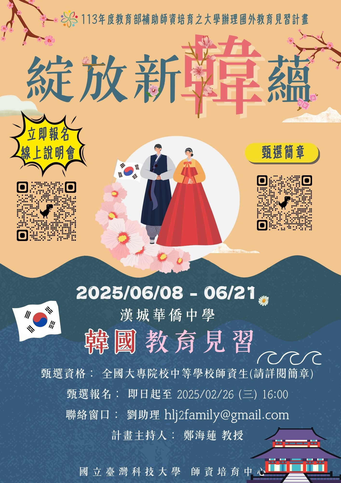 2025/06/08 ~ 06/21國立臺灣科技大學【韓國漢城華僑中學教育見習計畫】招生說明 2025-02-10 最新消息 / 校外活動公告 各位師培生好! 國立臺灣科技大學2025韓國漢城華僑中學教育見習交流計畫招生說明會即將展開! 名額有限,歡迎有興趣的同學,立即填寫說明會表單報名,甄選簡章請參閱表單內連結。 ★ 重要資訊★ 1.說明會時間:2025/02/13 (四) 15:002.地點:採取線上google meet (將於報名後寄發視訊會議連結)3.報名連結:https://forms.gle/C17dhqBWU9U1iAFBA4.招募對象:中等學校師資培育學生(詳細資格請查閱簡章說明) 若有任何疑問,歡迎隨時聯繫我們 國立臺灣科技大學鄭海蓮教授韓國教育見習計畫團隊 聯絡人:劉助理 團隊信箱:hlj2family@gmail.com You Might Also Like 檢送國立臺灣師範大學辦理「師資生潛能測驗系統」之個人帳號申請與報表導讀活動,敬請協助轉知學生及宣傳,請查照。 2025-10-14 檢送本校辦理「Best Education-KDP2024全國學校經營與教學創新國際認證獎」活動簡章,敬請轉知所屬學校教師踴躍報名參加,請查照。 2024-04-03 檢送銘傳大學師資培育中心「無間斷課程設計甄選比賽」 計畫及活動海報,請協助轉知全國之國中小在職教師 (含代理教師、實習教師) 或教育相關科系研究生、師資生, 請查照。 2023-02-09